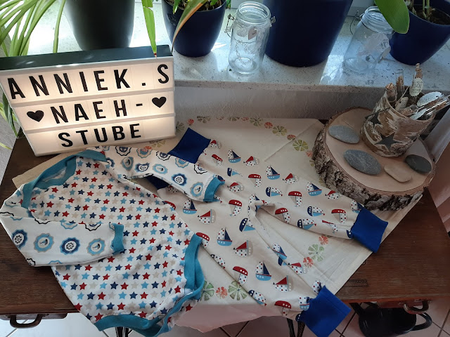 Die gleichen Schnitte, aber mit maritimem Jersey vom Stoffmarkt.